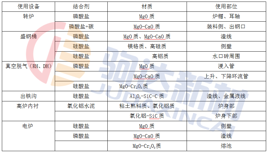 耐火噴補料按施工方法分濕法(泥漿法)噴補料、半干法(噴嘴混合式)噴補料和火焰法(熔射法)噴補料;按噴補料主材質可分為氧化鎂質、鈣鎂質、鎂鉻質、鎂碳質、硅酸鋁質和氧化鋁—碳化硅—碳質噴補料等;按使用條件分為轉爐用噴補料、電爐用噴補料、盛鋼桶用噴補料、真空脫氣爐(RH、DH)用噴補料、出鐵溝用噴補料和高爐內襯用噴補料等。不同冶金爐和裝備用噴補料材質與結合劑見表9-7。