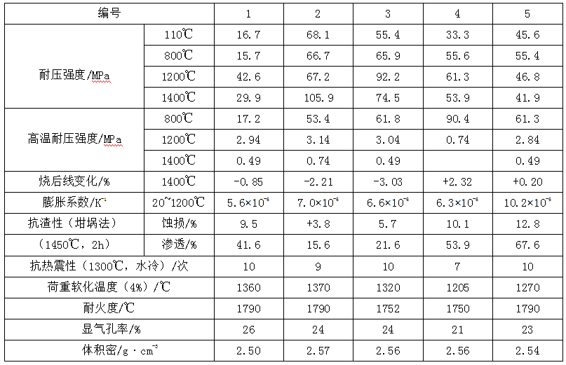 從表1-1中看出,水玻璃耐火搗打料比硫酸鋁耐火搗打料好些。在水玻璃耐火搗打料中,編號2即鋁鎂質耐火搗打料的性能,是比較好的。其抗渣性好、荷重軟化溫度和高溫耐壓強度較高,特別是1400℃燒后耐壓強度達到了105.9MPa,但燒后線收縮較大,達到2.21%。該料在高溫下能生成鋁鎂尖晶石,交錯生長,體積膨脹,且系耐火礦物,因此可提高其使用性能;鋁蠟石質耐火搗打料的特點是燒后呈膨脹,其值達到2.32%,使用時內襯不黏渣,所以適宜作盛鋼桶內襯,但高溫耐壓強度和荷重軟化溫度較低,則影響其使用;鋁質耐火搗打料的有關性能,介于二者之間,也能在鋼包上使用。
