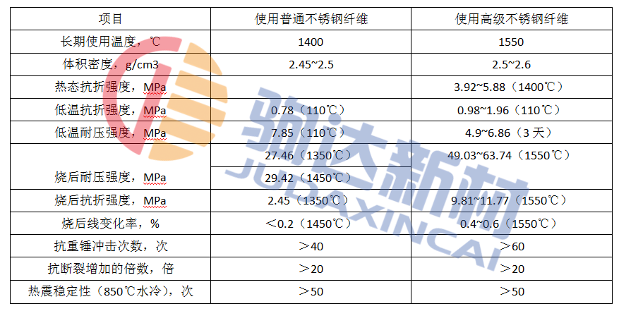 表1 不銹鋼纖維增強耐火澆注料性能表