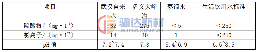 空氣中的酸性氣體CO2、CO2、H2S是高鋁澆注料發生碳酸化和硫酸化現象的原因之一,而現場澆注料用水質量也不容忽視,尤其是水中的SO42-和H+,對高鋁水泥水化物也起一定的侵蝕作用。表2為幾種水源質量對比。與武漢地區水源相比,鞏義大峪溝生產現場所用的水,其[SO42-]和[Cl-]指標高,其中[SO42-]超出了國家底面生活飲用水標準,而蒸餾水中[SO42-]超出了國家地面生活飲用水標準,而蒸餾水中[SO42-]和[Cl-]最低。這與生產現場附近有一個硫酸廠不無關系。
