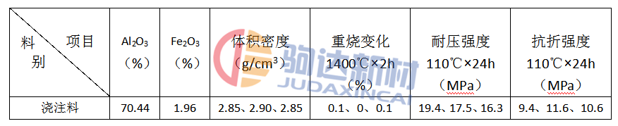 高鋁磷酸鹽耐火澆注料是采用PA-80膠結(jié)合的澆注料。它具有高強(qiáng)快硬、粘結(jié)強(qiáng)度大、施工周期短的優(yōu)點(diǎn),是熱工窯爐搶修澆注、冷補(bǔ)、熱補(bǔ)常用的耐火材料(表1)。