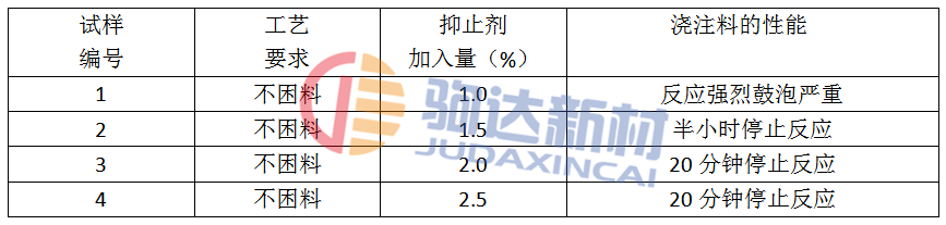 高鋁磷酸鹽澆注料采用不困料。添加抑止劑是項(xiàng)施工新工藝,但關(guān)鍵是控制好抑止劑的加入量。我們以高鋁礬土為原料(Fe2O3<1.5%),以江蘇武進(jìn)生產(chǎn)的PA-80膠作結(jié)合劑,反復(fù)實(shí)驗(yàn)抑止劑適宜的加入量為2~2.5%,試驗(yàn)情況見(jiàn)表4。