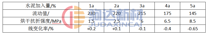 為使自流澆注料具有良好的自流、脫氣和密實性能、與傳統的澆注料相比,自流澆注料含骨料較少,基質較多,施工加水量也偏高,這往往導致燒后收縮較大,施工加水量也偏高,這往往導致燒后收縮較大,耐壓強度下降。為了對燒后線后所進行調整,以及獲得適宜的常溫和高溫強度,試驗研究了不同膨脹劑及加入量對材料性能的影響。試驗中發現,當不添加膨脹劑時,試樣燒后收縮達0.5%~0.8%,當分別加入膨脹劑a和b時,依加入量不同,燒后線
