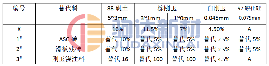 原生產(chǎn)配比X為基礎(chǔ)試驗(yàn)方案,其中88礬土15~8mm 10%、8~5mm 18%,1~0mm 97碳化硅 7%,CA70 純鋁酸鈣水泥 3%,添加劑5.03%,硅微粉、α-氧化鋁微粉適量,保持不變。分別以ASC磚、滑板磚、剛玉澆注料替代主要原料,試驗(yàn)方案見(jiàn)表2。