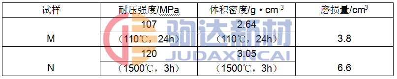 從耐磨性試驗方法可看出,要想得到好的耐磨性,試樣必須有較高的耐壓強(qiáng)度,骨料與基質(zhì)的硬度較大,骨料與基質(zhì)的結(jié)合強(qiáng)度也應(yīng)很好。本實驗用的骨料和基質(zhì)為合成料,其莫氏硬度較高。為7.5~8.5,致密度也高,具有金屬及非金屬的諸多性能。因此研制的澆注料具有較好的耐磨性。為驗證這一點,分別采用合成料和白剛玉為原料,加入相同的添加劑及結(jié)合劑,制成高強(qiáng)超耐磨澆注料(M)和低水泥剛玉澆注料(N),測其耐壓強(qiáng)度、體積密度及常溫磨損量,結(jié)果見表2。