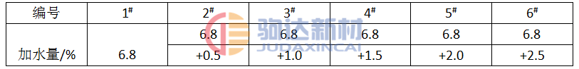 選用一組低水泥澆注料配方,配制25kg澆注料,攪拌均勻,均分為6組,取其中一組加水攪拌,以良好的流動性為標準,確定其加水量6.8%為基準加水量,然后在此基礎上分別增加0.5%、1.0%、1.5%、2.0%、2.5%的加水量(見表2),通過測得該組低水泥澆注料在烘干、燒后的體積密度、抗折強度、耐壓強度等理化指標,比較不同加水量對材料性能的影響。