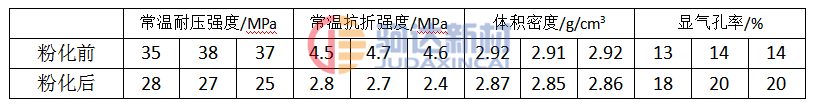 坯體的致密度也是引起澆注料表面粉化的一個重要因素,當坯體的致密度低時,氣孔率增大,空氣中的水幾二氧化硫可以更容易地通過擴散進入坯體中,使得損毀反應發生,導致坯體由表及里的分解粉化。