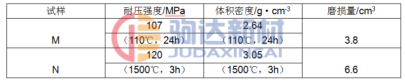 從耐磨性試驗方法可看出,要想得到好的耐磨性,試樣必須有較高的耐壓強度,骨料與基質的硬度較大,骨料與基質的結合強度也應很好。本實驗用的骨料和基質為合成料,其莫氏硬度較高。為7.5~8.5,致密度也高,具有金屬及非金屬的諸多性能。因此研制的澆注料具有較好的耐磨性。為驗證這一點,分別采用合成料和白剛玉為原料,加入相同的添加劑及結合劑,制成高強超耐磨澆注料(M)和低水泥剛玉澆注料(N),測其耐壓強度、體積密度及常溫磨損量,結果見表2。