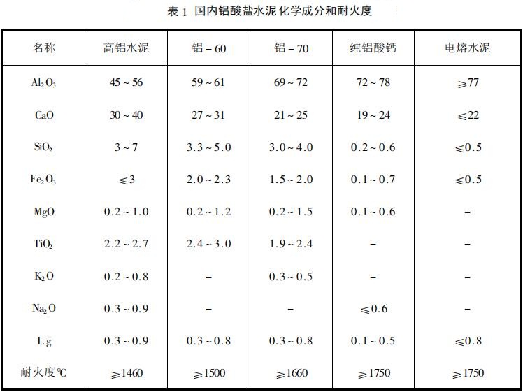 鋁酸鈣是由燒結法或熔融法生產的鋁酸鈣熟料經細磨而制成的水硬性改凝材料。它具有快硬高強、耐火、抗硫酸鹽侵蝕的特點。國內鋁酸鹽水泥的典型化學成分如表1所示