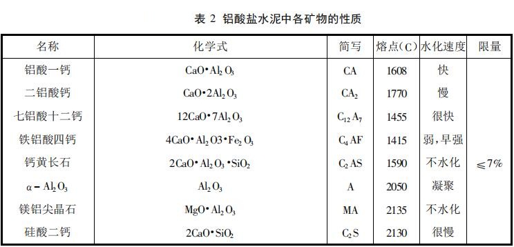 鋁酸鹽水泥的結合性能主要是由于鋁酸鈣的水化而實現的。水泥的化學成分不同,其礦物的成是不同的。在鋁酸鹽水泥中,可能出現的礦物及其耐火性能與水化性能如表2所示