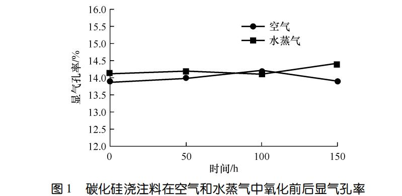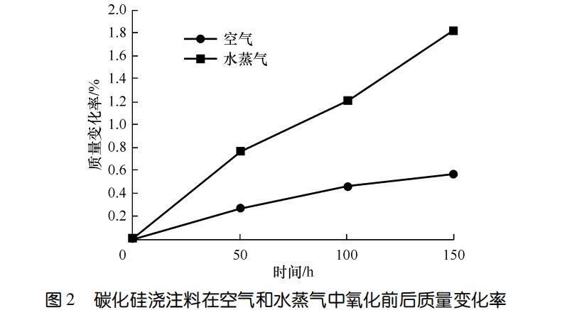 1示出了碳化硅澆注料在空氣和水蒸氣氧化前后的顯氣孔率。可以看出,無論是空氣還是水蒸氣氧化顯氣孔率均變化不大。氧化150h試樣與氧化前相比,水蒸氣條件下的顯氣孔率略有增大;空氣條件下的顯氣孔率略有減小。可能與水蒸氣條件下試樣結構遭到較大破壞有關。一般情況下,碳化硅氧化會因氧化產物SiO2等堵塞氣孔導致氣孔率在氧化初期下降明顯,后期逐漸趨于平穩,但對于碳化硅澆注料卻沒有出現早期顯氣孔率下降的情況。可能
