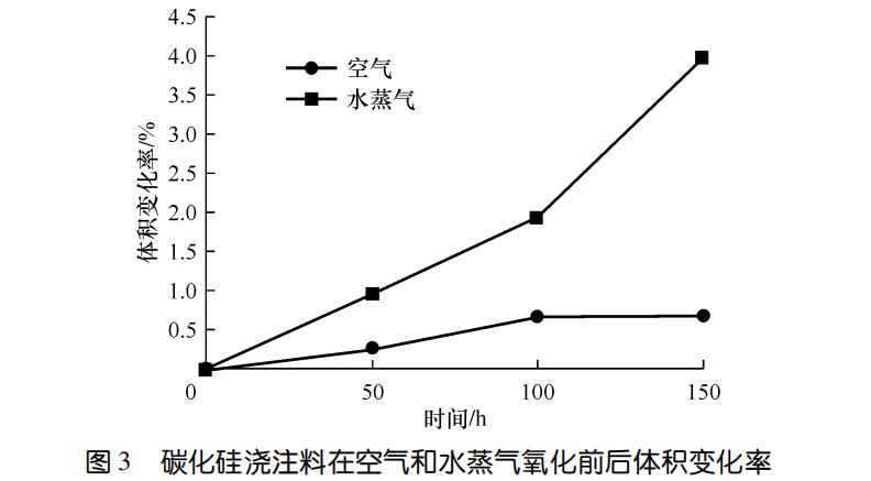 3示出了碳化硅澆注料在空氣和水蒸氣中氧化前后體積變化率。可以看出,空氣條件下體積變化率明顯小于水蒸氣條件下的。隨著時間的延長,空氣條件下的體積變化率趨于平緩和穩定;在水蒸氣氧化后期,體積變化率異常增大,與試樣的結構遭到較大破壞引發顯氣孔率略有增加相吻合。高溫下水蒸氣向SiC磚孔隙中的滲透能力增加,同時由于高溫蒸發而造成的強制流動,改善了反應動力學條件,表觀活化能較小,氧化反應易于進行