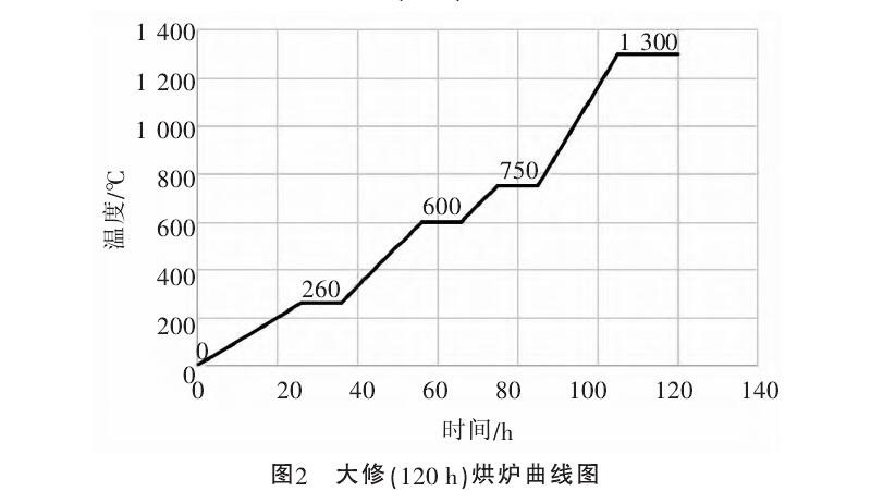 烘爐溫度上升情況基本符合烘爐溫度曲線圖表的規(guī)定。溫度上升不應(yīng)有顯著的波動,也不應(yīng)太快,否則將產(chǎn)生不均勻膨脹,導(dǎo)致砌體破壞。圖1和圖2列舉了兩種典型的烘爐曲線圖。