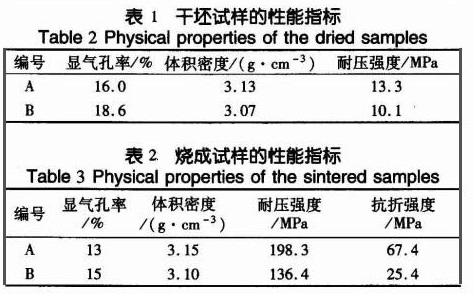 實驗所用原料為棕剛玉、白剛玉、碳化硅、硅粉等。在實驗中設計AB兩種配方,其中A為硅—(白剛玉+棕剛玉)—碳化硅質,B為棕剛玉—碳化硅質。在混碾機中混合均勻后成型,成型壓力為350MPa。將試樣分成兩批,第一批只在110℃,24h烘干后即測量其顯氣孔率、體積密度、常溫耐壓強度;另一批烘干后再電爐中于1500℃保溫6h 燒成。自然冷卻后測量其顯氣孔率、體積密度、常溫耐壓強度和常溫抗折強度,進行載荷-變形實驗。