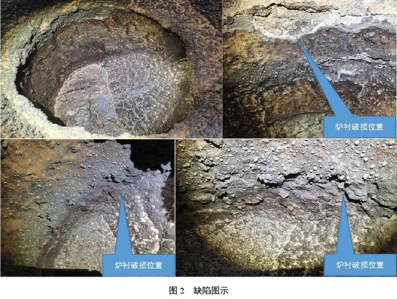 在鐵水包內進行孕育處理時,鐵水運動劇烈,加重了襯體的侵蝕。采用鑄造用除渣劑對鐵水表面的熔渣進行聚集和粘結,在除渣過程中熔渣會變粘,易掛在襯體壁上,難以清理。加上攪動鐵水的沖刷,以及間歇式作業所造成的溫度波動,在鐵水包內襯,特別是渣線部位耐火澆注料的損毀加劇,如圖2所示。