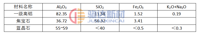 根據(jù)上述鍛造加熱爐爐門破損原因分析,鄭州駒達(dá)新材料認(rèn)為通過合理選擇澆注料的原材料,組分配比的調(diào)整和外加劑方面的研究,可以改善爐門澆注料的使用性能,達(dá)到提高爐門使用壽命的目的。為此,在爐門澆注料的原材料選擇方面進(jìn)行了相應(yīng)的研究與分析。選取了耐火度、抗熱震性及高溫抗沖刷性能優(yōu)良的特級(jí)焦寶石和一級(jí)高鋁熟料作為澆注料的骨料,以改善澆注料的高溫性能。從改善澆注料的常溫與高溫結(jié)合強(qiáng)度、體積穩(wěn)定性等方面考慮,選取一級(jí)高鋁粉為澆注料的主要粉料,水泥及微粉為復(fù)合結(jié)合劑,藍(lán)晶石為膨脹添加劑,水泥及微粉為復(fù)合結(jié)合劑,藍(lán)晶石為膨脹添加劑。從改善澆注料的常溫與高溫結(jié)合強(qiáng)度、體積穩(wěn)定性等方面考慮,選取一級(jí)高鋁粉為澆注料的主要粉料,水泥及微粉為復(fù)合結(jié)合劑,藍(lán)晶石為膨脹添加劑。從改善澆注料抗熱震性、防暴性和降低密度方面考慮,選取了力學(xué)性能與抗高溫粉化性能優(yōu)良的無機(jī)高鋁纖維為防爆、增強(qiáng)添加劑。此外,為了滿足鍛造加熱爐爐門澆注料的施工性能和其他相關(guān)的使用性能,選擇了多種有機(jī)與無機(jī)減水劑、分散劑為復(fù)合外加劑。澆注料主要原材料的理化性能如表1所示。