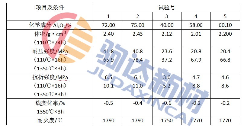 根據(jù)上述的原材料選擇原則與澆注料性能改進(jìn)思路,按照澆注料中Al2O3的含量不同進(jìn)行了多個(gè)配方設(shè)計(jì),并在實(shí)驗(yàn)室進(jìn)行了配方調(diào)整實(shí)驗(yàn)機(jī)抗熱震性實(shí)驗(yàn)。按照實(shí)驗(yàn)預(yù)定的高抗熱震性技術(shù)要求,確定了5個(gè)性能優(yōu)良的澆注料配方,分別制成40mm×40mm×160mm的試樣進(jìn)行詳細(xì)的理化性能檢測,具體檢測結(jié)果如表2。